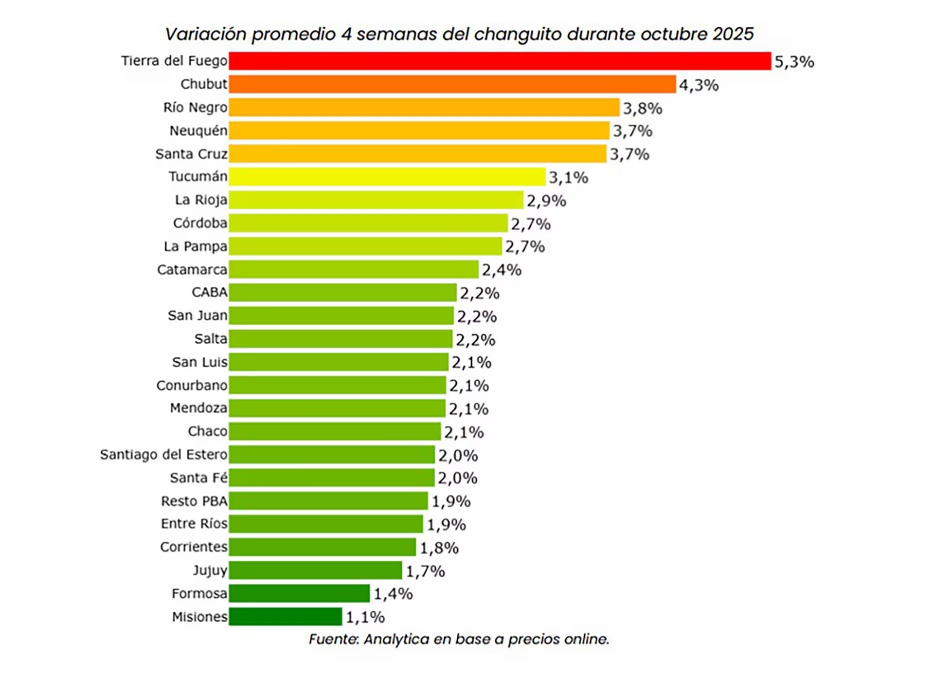 Analytica también comparó la variación absoluta de precios respecto del 26 de septiembre. Los mayores aumentos en pesos se dieron en Tierra del Fuego (+$45.544), La Pampa (+$42.392) y Chubut (+$39.373). Los ajustes más moderados se ubicaron en Formosa (+$14.112), Neuquén (+$13.930) y San Luis (+$4.572).