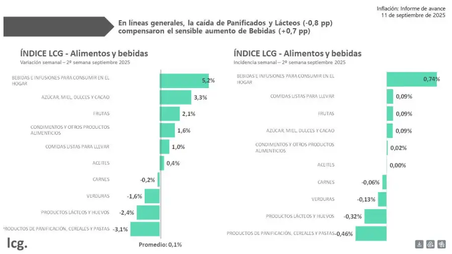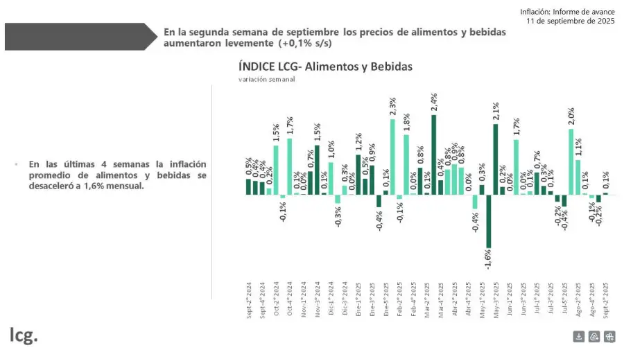 En la segunda semana de septiembre, la inflación promedio en alimentos y bebidas aumentó un 0,1%, según lo indica un informe privado realizado por LCG en su nuevo informe. Detalla además que en las últimas cuatro semanas, se desaceleró a 1,6% mensual.