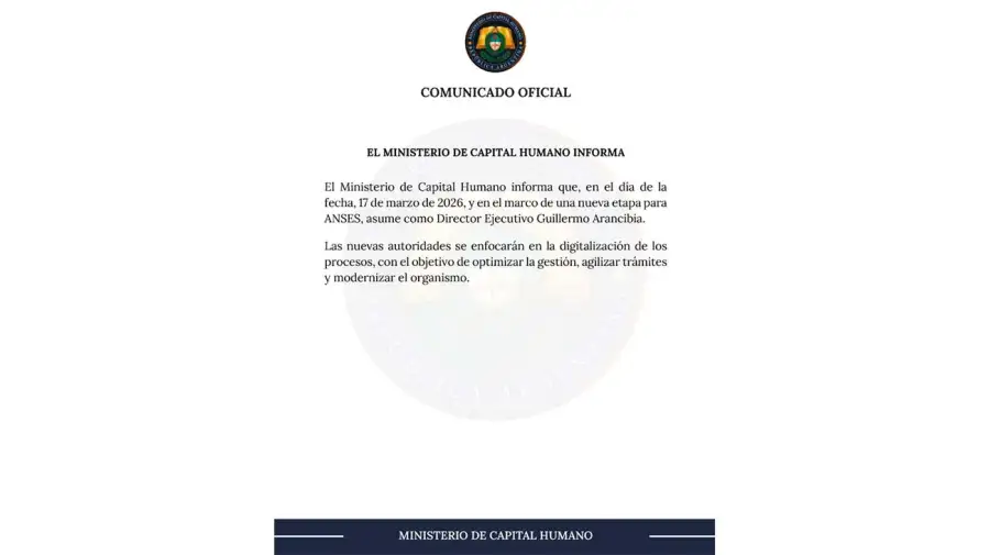 A través de un comunicado oficial, difundido en la red social X, el Ministerio de Capital Humano informó que el 17 de marzo de 2026 asumió como Director Ejecutivo de la ANSES Guillermo Arancibia, en el marco de lo que definieron como “una nueva etapa” para el organismo previsional. La comunicación oficial ratificó la decisión del Poder Ejecutivo de avanzar con cambios en la conducción y formalizó el reemplazo tras la renuncia presentada por Fernando Bearzi.