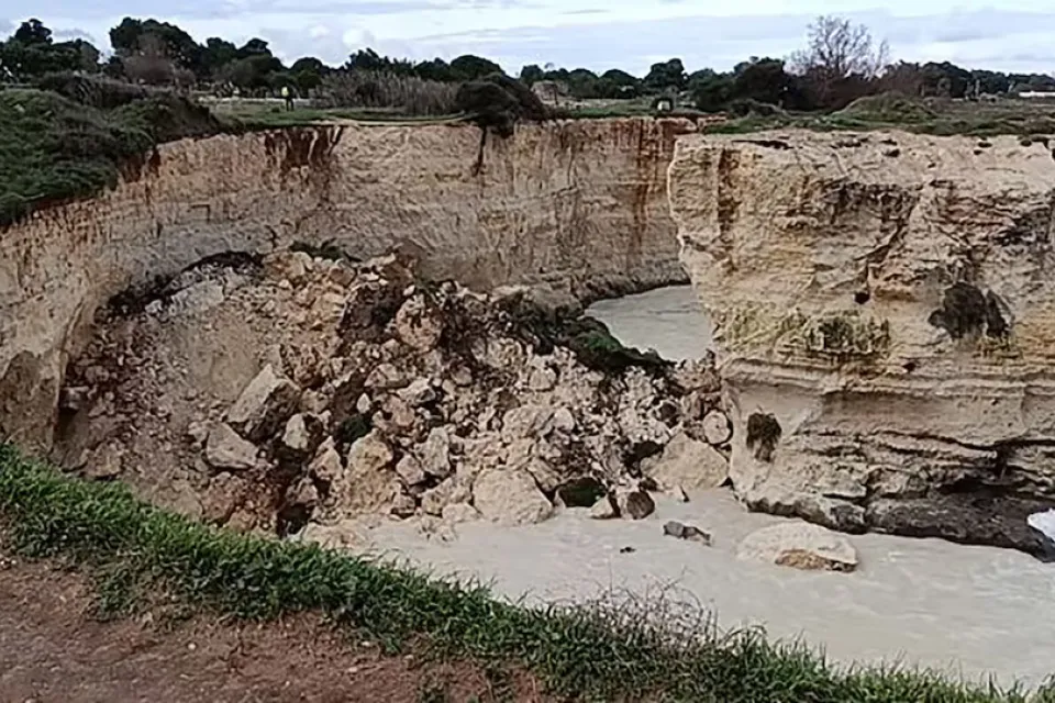 El llamado Arco de los Enamorados, una formación rocosa emblemática del sur de Italia, se desplomó al mar durante la noche del 14 de febrero tras un fuerte temporal que afectó a la región de Apulia. El derrumbe ocurrió en la zona costera de Melendugno sin provocar heridos, en medio de intensas lluvias.