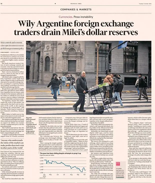 En su artículo “Astutos operadores argentinos de divisas drenan las reservas en dólares de Milei”, el diario británico Financial Times analiza cómo las restricciones cambiarias y la crisis económica están generando un nuevo ciclo de especulación en el mercado local.