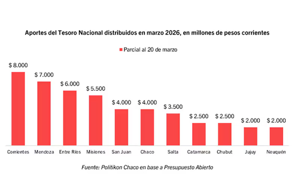 Con la lupa sobre el acumulado en lo que va del año, Corrientes se mantiene como la más beneficiada, ya que recibió $ 14.000 millones ($ 3000 millones en enero y febrero y los $ 8000 millones de ahora). El segundo puesto es para Misiones con $ 9500 millones ($4000 millones en febrero y $ 5500 millones este mes) y Salta queda tercera con $ 7500 millones ($4000 millones en febrero y $ 3500 millones en marzo).