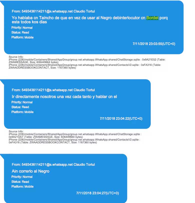 En noviembre de 2018, los Tórtul evalúan si les convenía desplazar a uno de los interlocutores: “Yo hablaba cn Taincho de que en vez de usar al Negro debinterlocutor cn Bordet porq esta todos kos dias. Ir directamente nosotros una vez cada tanto y hablar cn el. Ain correrlo al Negro”.