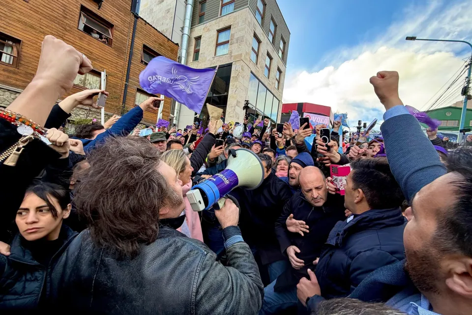 El líder de La Libertad Avanza tenía previsto realizar una caminata con los candidatos locales por la tarde, pero la actividad debió limitarse a un breve discurso ante militantes violetas en la puerta del hotel en el que se alojó, debido a la presencia de manifestantes kirchneristas que repudiaron la presencia del mandatario.