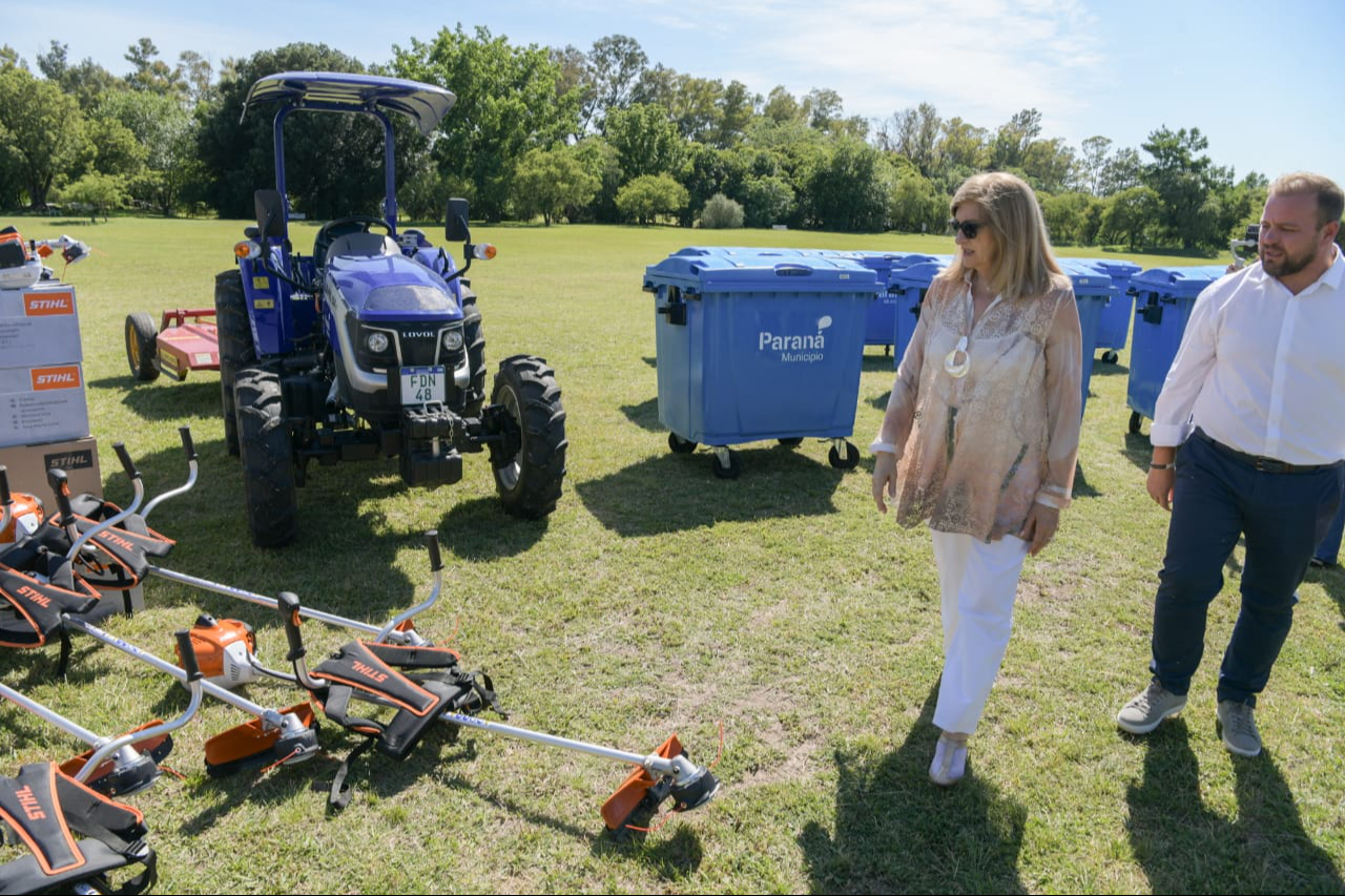 En esta etapa, se incorporaron 1.000 contenedores, 2 tractores, 4 camiones utilitarios -doble cabina, caja playa, marca Mercedes Benz-, más de 100 desmalezadoras y 24 sopladoras. Estas herramientas permiten mejorar la eficiencia del trabajo diario, cuidar los espacios públicos y acompañar el esfuerzo de los equipos municipales para que Paraná esté más limpia y ordenada.